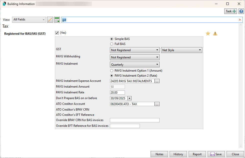 Building Information: ensure that the PAYG Instalment fields, which include PAYG Instalment with the relevant option, Instalment Expense, and Instalment Amount or Rate (depending on what option has been set), Don't Prepare BAS on or before (if a new building setup) and ATO Creditor Account.