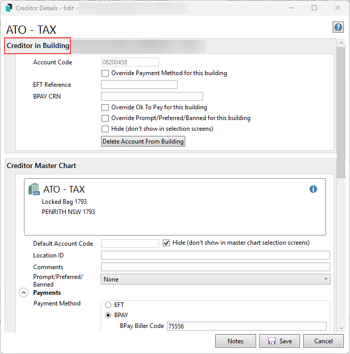 The ATO defined Creditor is set in the New Building Setup screen for all new buildings and amended in Building Information - GST / Tax Setup. The Creditor reference numbers for payment for BPAY or EFT are set in Creditor Maintenance.