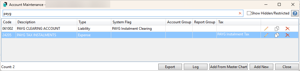 Account Maintenance: ensure an account code is available for the PAYG Instalment Tax Code, including the system clearing account.