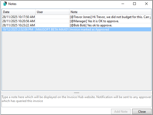 - Enter the response, then click Add Note. The invoice will automatically upload with the note for the approver to view on the Invoice Hub.