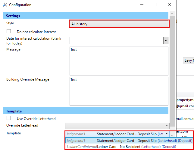 3. Click the configuration cog wheel to review the Configuration - this is where you can set the Style - Year to date, or Month to date, From last zero balance, Selected month, Year to date - include old year or All History to include all historical year data. The Date for interest calculation (Blank for Today) can be set for settlement here in the Configuration.