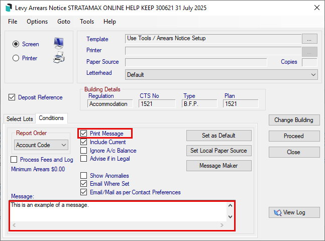 The Message Maker is for creating a message that can be displayed on Levy Notices, Arrears Notices, Ledger Cards and Invoices. The message may be changed to suit a particular situation or even for an individual owner. It is important to review the template currently selected to ensure there is room for a message to display.