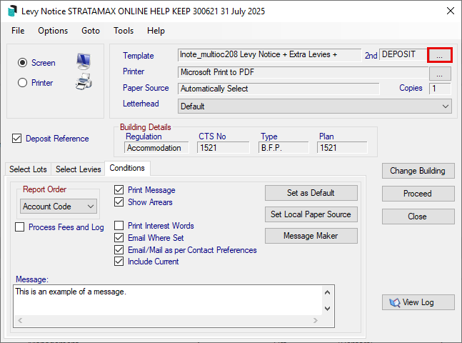 - Preview a Levy Notice Reports, Arrears Notice, Invoice Printing, Ledger Card or Utility Bill to ensure there is space for the message prior to distributing. Adjust the Template if required (screen shot below).