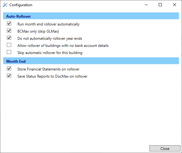 - Allow rollover of building with no bank account details: Allows a building to be rolled over without bank account details present in the Bank Account Setup screen. By default, this is not allowed.