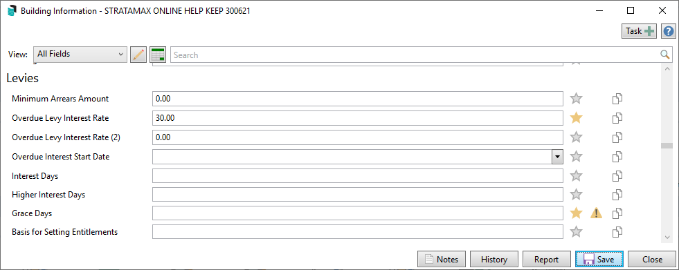 Overdue Levy Interest Rate | To enter Annual Interest Rate for the selected Building / Plan. | Yes – this is the mandatory field for determining if a Building / Plan will look to calculate any interest. | Other factors may determine what will calculate interest – see below for calculation. |
