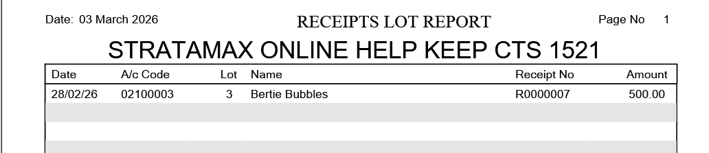 ![]() | The instructions in this article relate to the Receipts Report located by searching or selecting from StrataMax. |