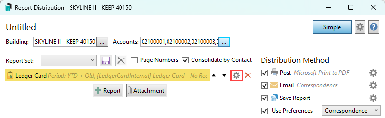 - Review the Distribution Method. If the report set is to be saved to DocMax, ensure that a profile is set with the cogwheel.