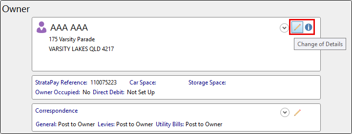 - In the Roll screen, click the pencil icon next to the owner to complete a Change of Details to access the (Combined Owner) Name and combined ownership information, or adjust the combined ownership information at the Change of Ownership stage when selecting the Change Ownership button following the Change of Ownership process.