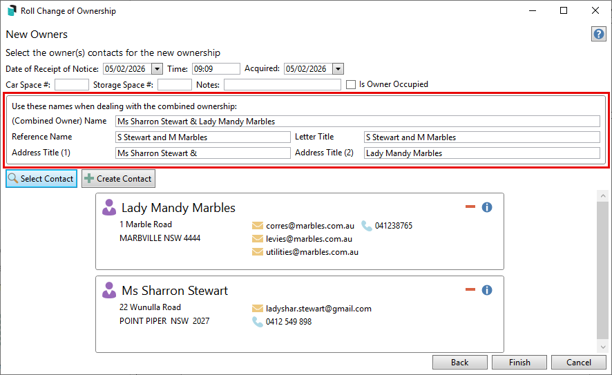 If there are multiple Contacts attached to a lot in the Roll, a (Combined Owner) Name, Reference Name, Address Title (1), Address Title (2), and Letter Title will be created. These fields can be adjusted to suit office formatting when completing a Change of Ownership or a Change of Details in the Roll.
