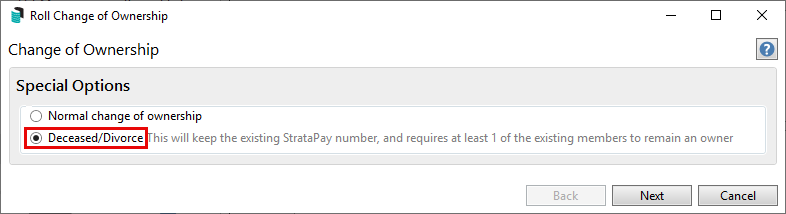 There is an option to keep some of the original owners due to a Deceased/Divorced ownership change. If there are two or more Contacts on a lot and a Change of Ownership is completed, you will be prompted to select which Contact to retain, which will also keep the StrataPay Reference Number.