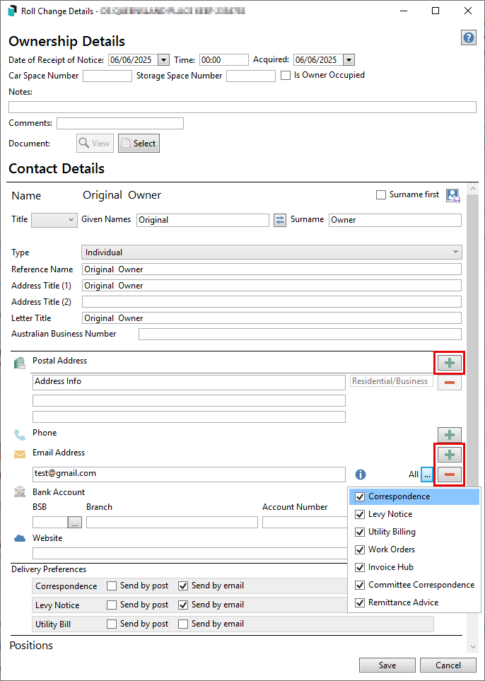 - This can be assigned to its specific purpose when entering an email address. For example, use a specific email address for Levies, Correspondence, or Invoice Hub. A separate email can be recorded for each type if needed. If all details should be sent to one email address, this should not be changed.