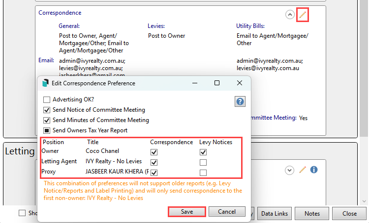 - Within the Edit Correspondence Preference area, tag the required contacts to receive the correspondence or levy notice. Click Save.