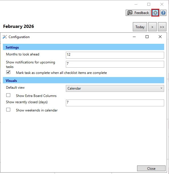 - Show notifications for upcoming tasks: This is the number of days to include for notifications. To disable notifications adjust to 0. (Default 7 day notification period). Refer to Task Notifications heading below.