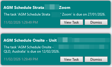 All tasks that are due will show as a notification in the notification bell on the desktop of StrataMax to assist with managing and staying across upcoming tasks. To receive a notification the following rules apply: