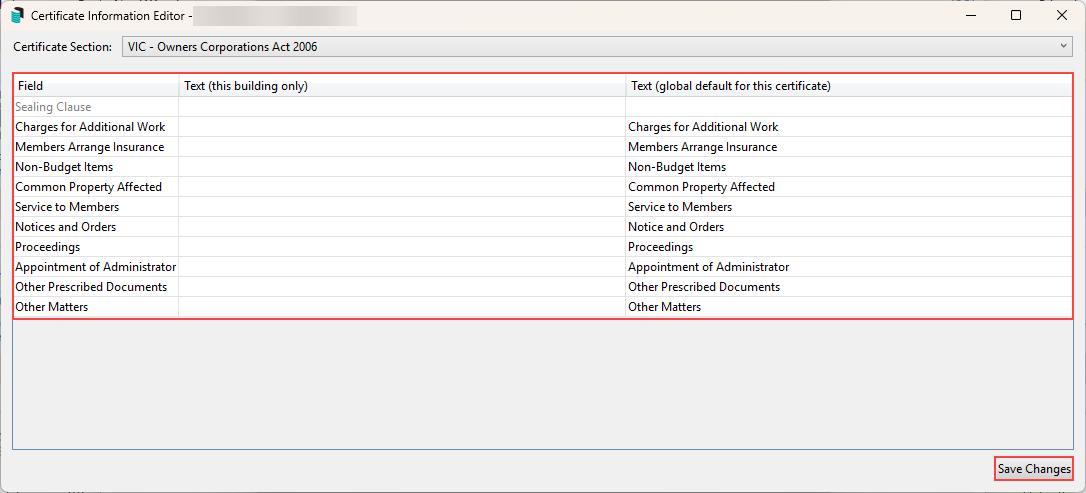 The certificate requires provision of the Statement of Advice, the Owners Corporation Rules, and minutes of the last Annual General Meeting. This information can be added to the certificate by using Document Inclusion.